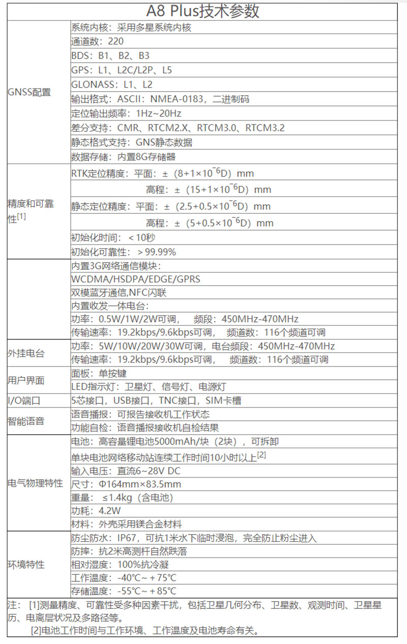 A8 Plus作为经典作品的延续,无论外部材质,操作的优化,还是内部的储存,连接的方式等都有了巨大的提升,镁合金外壳,更小的体积,8G存储,支持NFC闪联,Mini USB通用接口,高能能大功率电台,3G网络通讯,收发一体电台,新一代iHand30手簿,全新UI的Hi-Survey测量软件