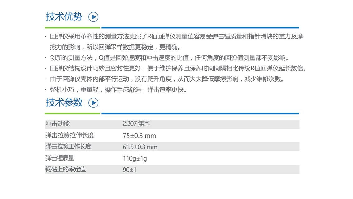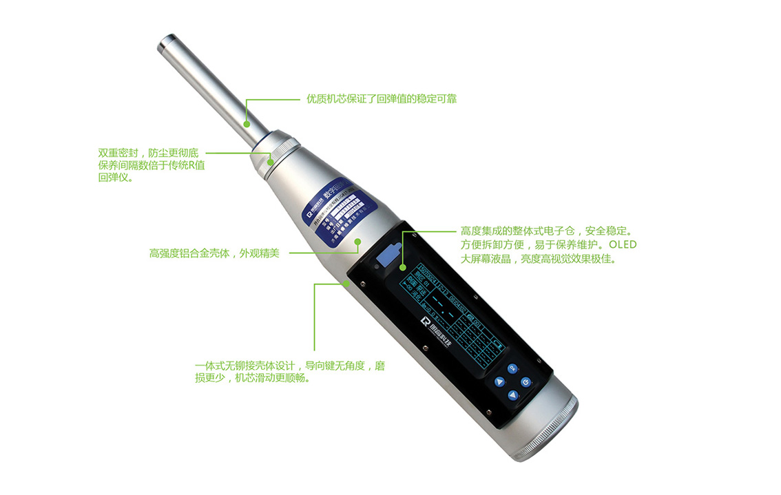 朗睿科技把传统R值回弹仪的优点和当前最先进电子技术结合起来,通过自主研发,创造了一款全新理念的能量式Q值回弹仪。回弹仪的测量原理是采用冲击后的能量与冲击前的能量商值,定