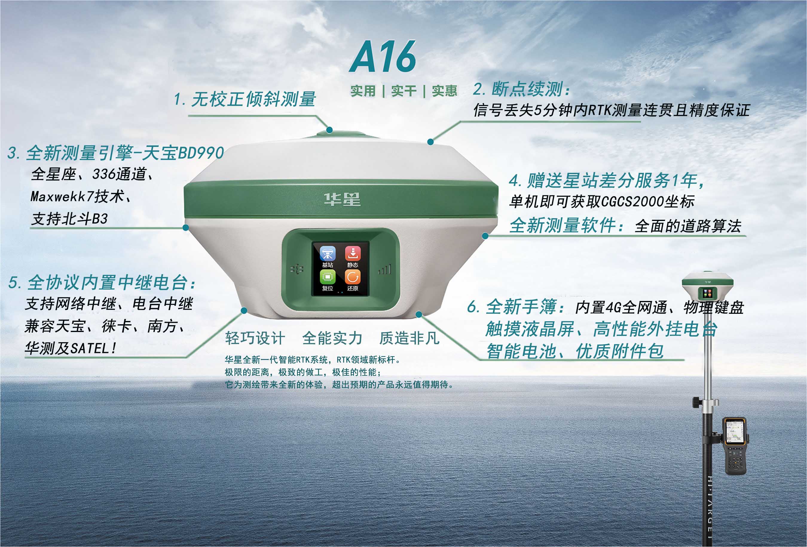 ◇ 新一代小型智能RTK,配新一代测量引擎BD990,提供智能测绘整体解决方案;